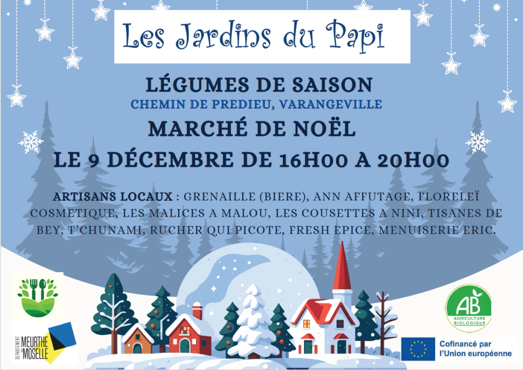 Après le succès de l’édition 2024, les Jardins du Papi se relancent dans l’organisation d’un marché de Noël le mardi 09 novembre de 16h00 à 20h00. Une bonne occasion d’acheter encore quelques cadeaux qui ont du sens, ou de faire le plein d’ingrédients locaux et bios pour vos repas de fêtes. Ça se passe chemin du Prédieu à Varangéville, et ça va être chouette !